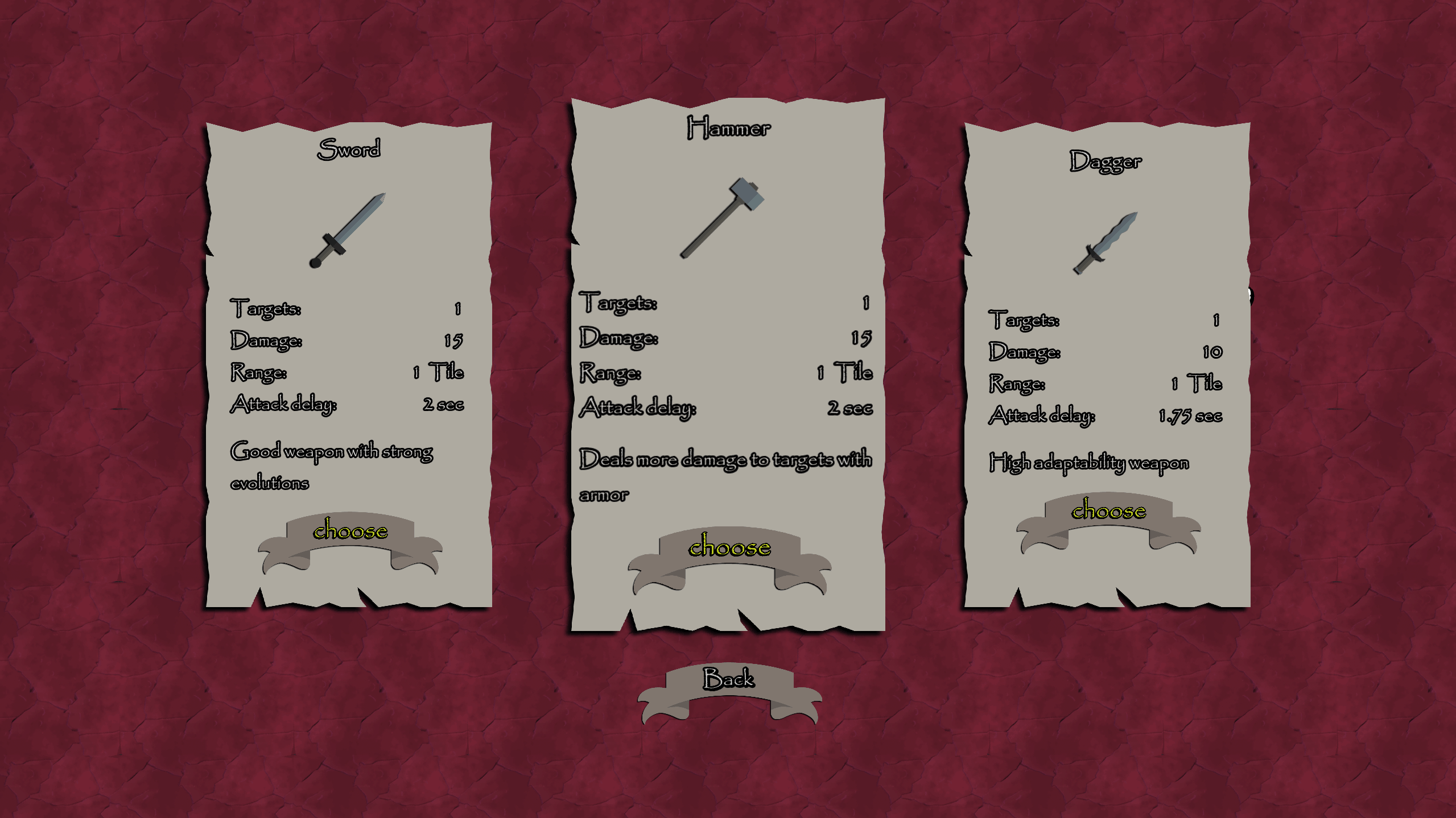 As for balance, so far I don't think any one is better or worse than another, but I shall try seeing how far I can get using just one weapon type and get back to you on that. So far what has gotten me far is good pathing and weapon placement. Though weapon descriptions will help such as letting players know that enemies will walk right through tiles with spear weapons.